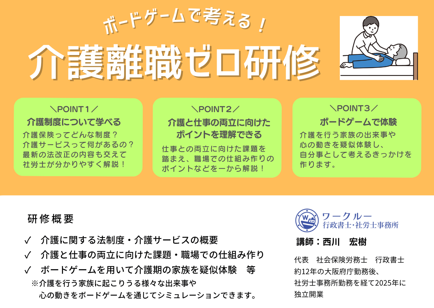 具体的には、社労士として介護に関する法制度の解説や、介護と仕事の両立の課題やポイントの説明などを行い、それに加えて、ボードゲーム形式で介護期の家族のリアルを疑似体験できる研修(セミナー)を開催できます。